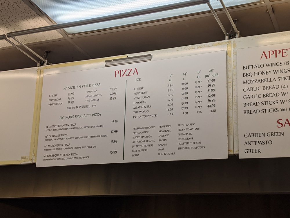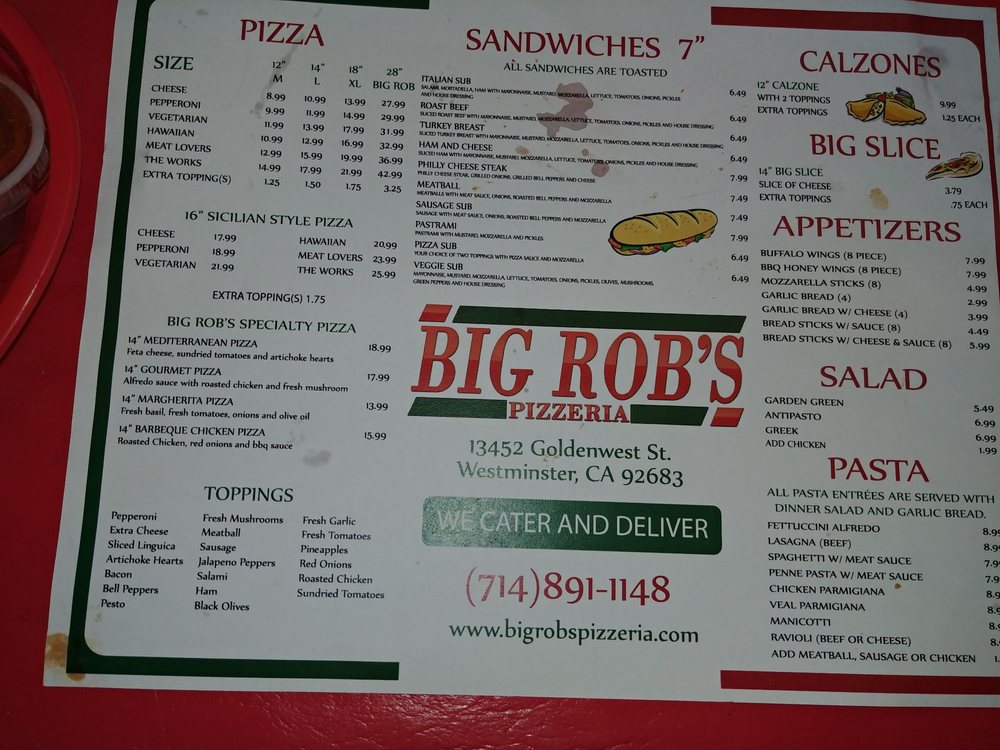 Big Rob’s Pizzeria, located in Westminster, CA, offers a diverse menu of Italian pizzas and sandwiches. Their 12" medium pizzas range from classic cheese to flavorful Hawaiian and meat lovers options. The Works pizza stands out with its combination of pepperoni, ham, sausage, veggies, and black olives. Additionally, their 7" sandwiches like the Italian Sub and Ham and Cheese are toasted to perfection. Customers praise the friendly service and high-quality ingredients, with many returning for the delicious, crispy crust and perfectly flavored sauce. The menu also includes beverages like cold sodas. Overall, Big Rob’s Pizzeria is a local gem worth visiting for authentic and satisfying Italian dishes.